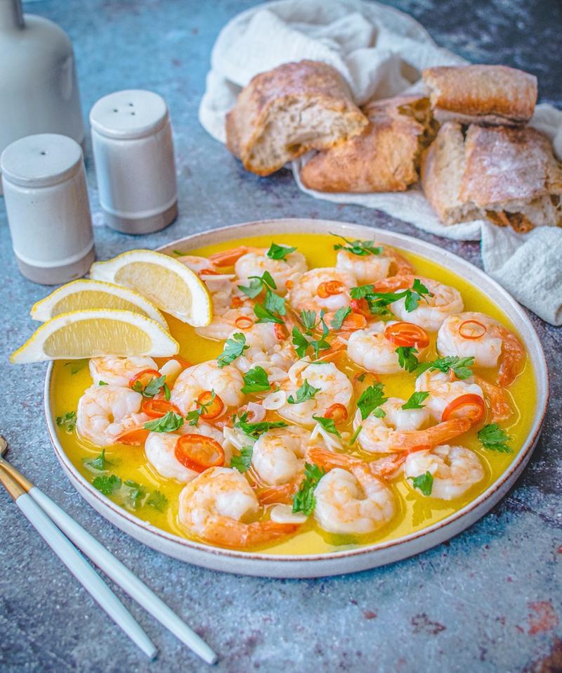 - Podawaj krewetki z makaronem lub pieczywem do maczania w sosie.